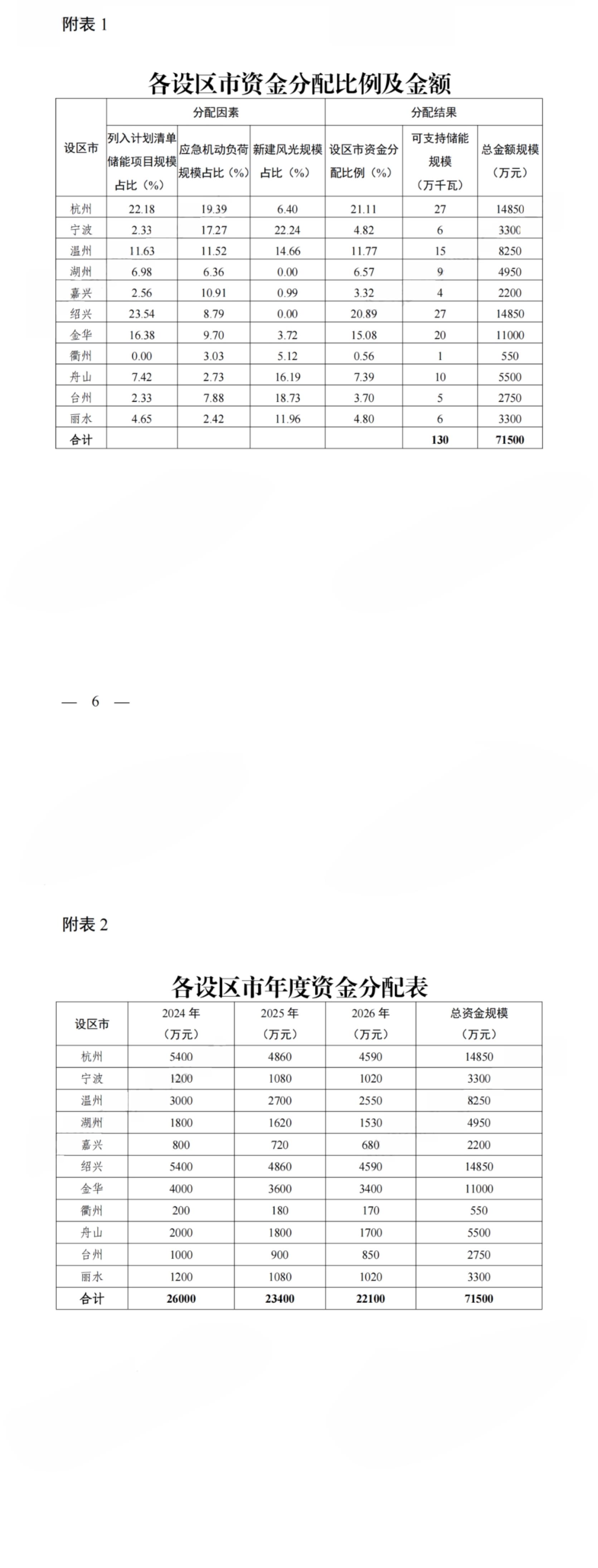 各设区市资金分配比例及金额详见附表1,按照《省发展改革委省能源局关于浙江省加快新型储能示范应用的实施意见》(浙发改能源〔2021〕393号)文件精神,2024-2026年分别按照200元/千瓦·年、180元/千瓦·年、170元/千瓦·年的补偿标准发放补偿,年度资金分配情况详见附表2。