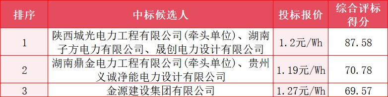 最终中标候选人结果显示,项目第一中标候选人为陕西城光电力工程有限公司(牵头单位)、湖南子方电力有限公司、晟创电力设计有限公司,投标报价为1.2元/Wh。