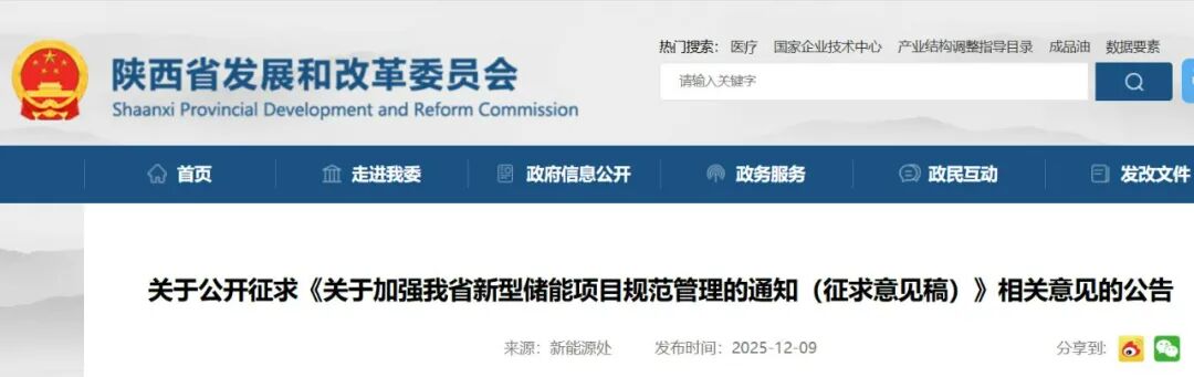 12月9日,陕西省发改委发布《关于加强我省新型储能项目规范管理的通知(征求意见稿)》,并向社会公开征求意见。