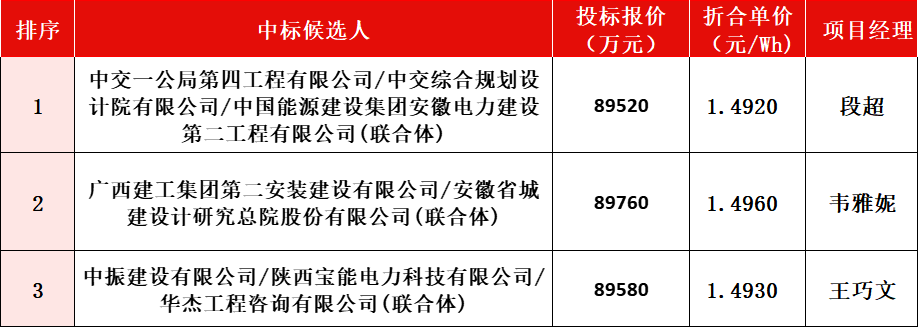 该项目第一中标候选人为中交一公局第四工程有限公司/中交综合规划设计院有限公司/中国能源建设集团安徽电力建设第二工程有限公司(联合体),投标报价89520万元,折合单价1.4920元/Wh;