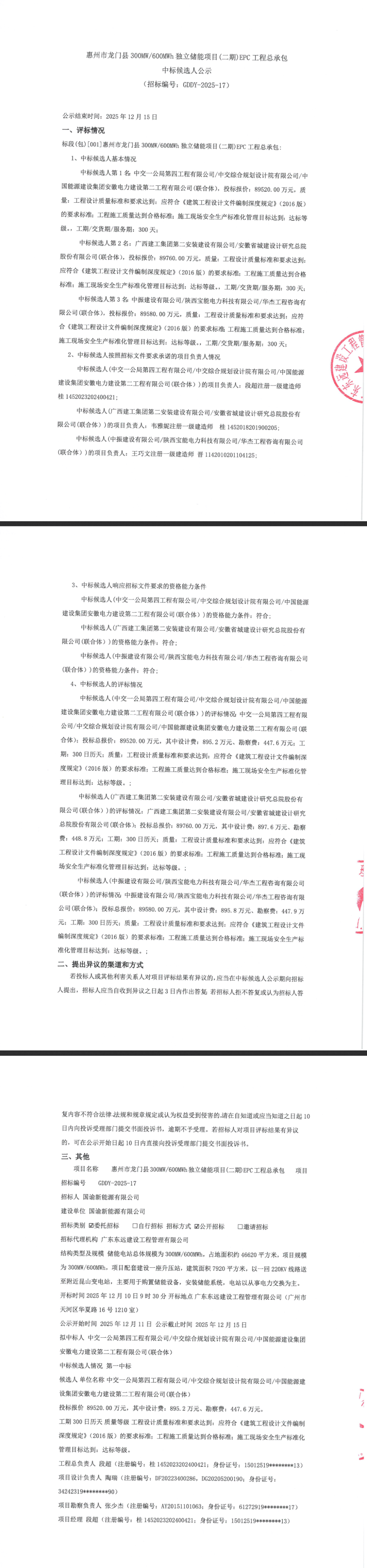 碳索储能网获悉,12月11日,惠州市龙门县300MW/600MWh独立储能项目(二期)EPC工程总承包公布中标候选人公示。