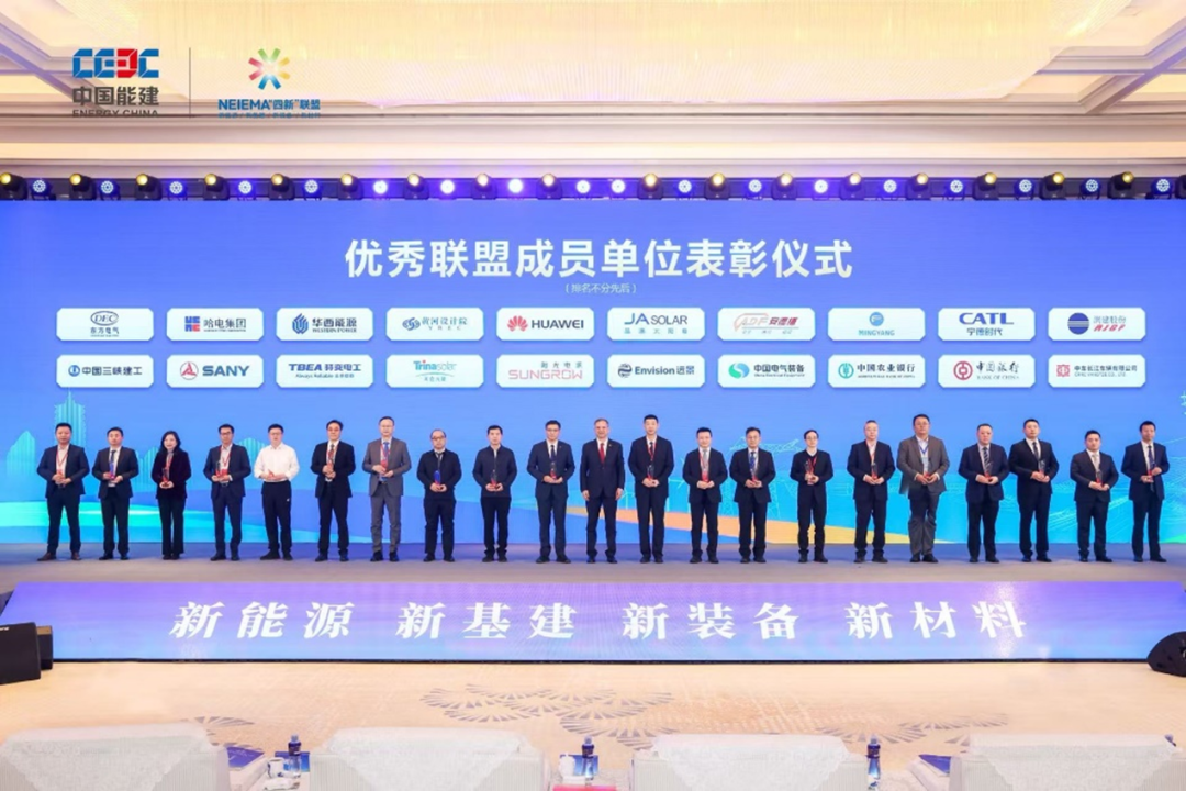 作为优秀成员单位代表,天合光能董事长高纪凡登台发言,他重点提及天合光能与中国能建的长期协同基础:“天合光能与中国能建的合作早已埋下深厚伏笔,自2021年起便开启协同奋进之路:先后与中能建江苏电力设计院、中能建上海成套等单位达成深度合作,2022年联合发起成立中国新型储能产业创新联盟,聚力推动新型储能技术研发与产业升级;2023至2025年持续深化协同,加入中国能建新能源国际投资联盟,凝聚产业链合力发展。”