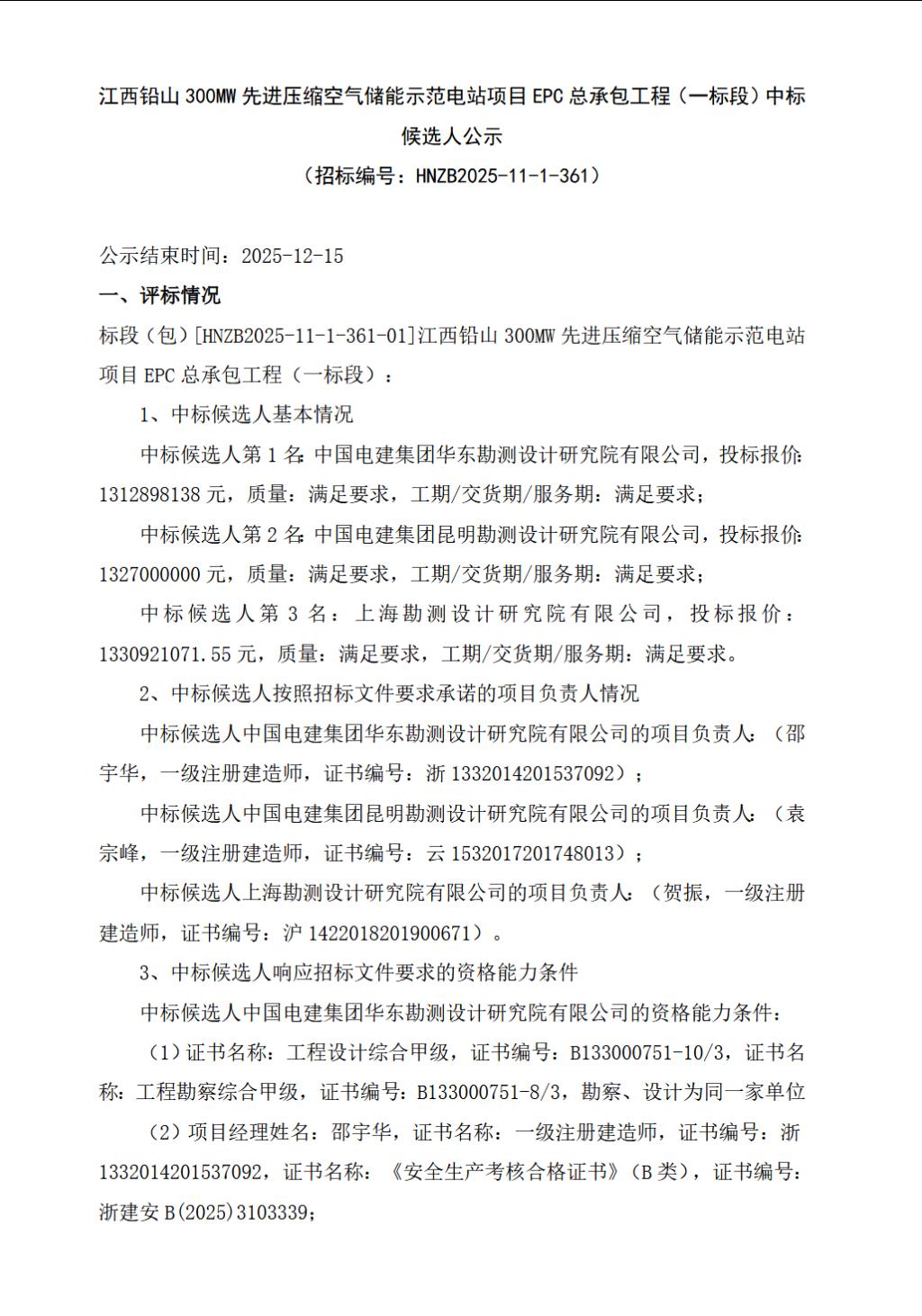 2025年12月12日,江西铅山300MW先进压缩空气储能示范电站项目EPC总承包工程(一标段)中标候选人公示正式发布。