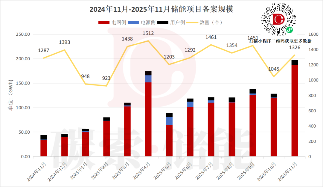 项目数量则呈现“波动中加速”的增长态势,11月以1326个项目刷新近半年纪录,较10月的1045个增长26.9%,这一变化,不仅反映出市场投资热情的高涨也可看出各地储能项目审批流程优化、落地效率提升的积极成效。