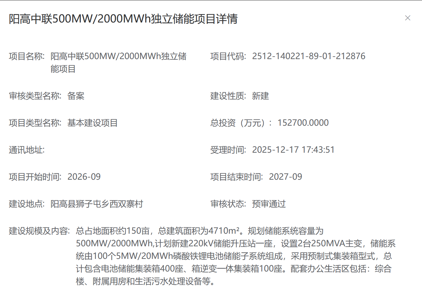 12 月 17 日,山西政务服务平台公示了阳高中联 500MW/2000MWh 独立储能项目的备案详情,该项目已通过预审,计划 2026 年 9 月启动建设,2027 年 9 月竣工投用,将成为大同阳高地区新型储能领域的重点项目。