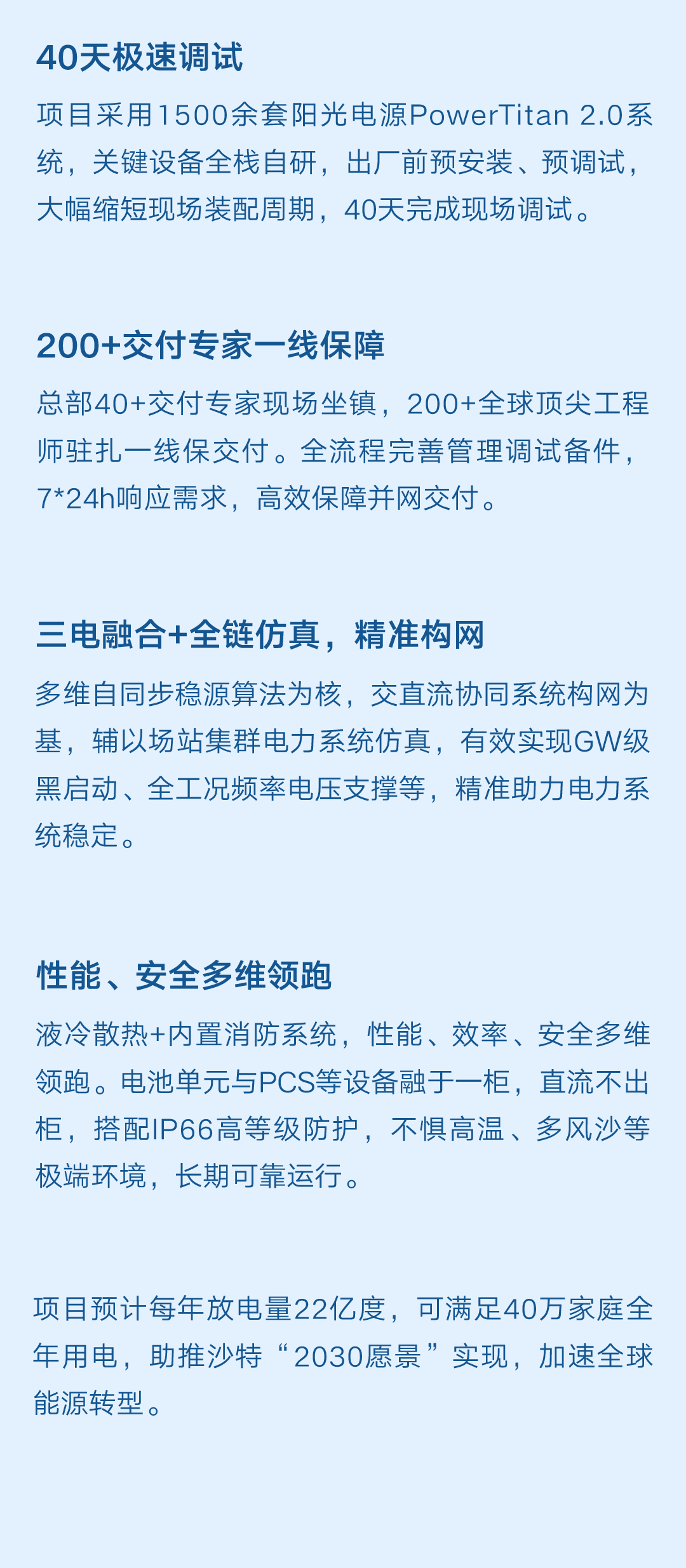 近日,沙特7.8GWh储能项目全容量并网,一举创下多个全球之最。阳光电源一体化交付,树立全球超大型构网储能项目标杆。