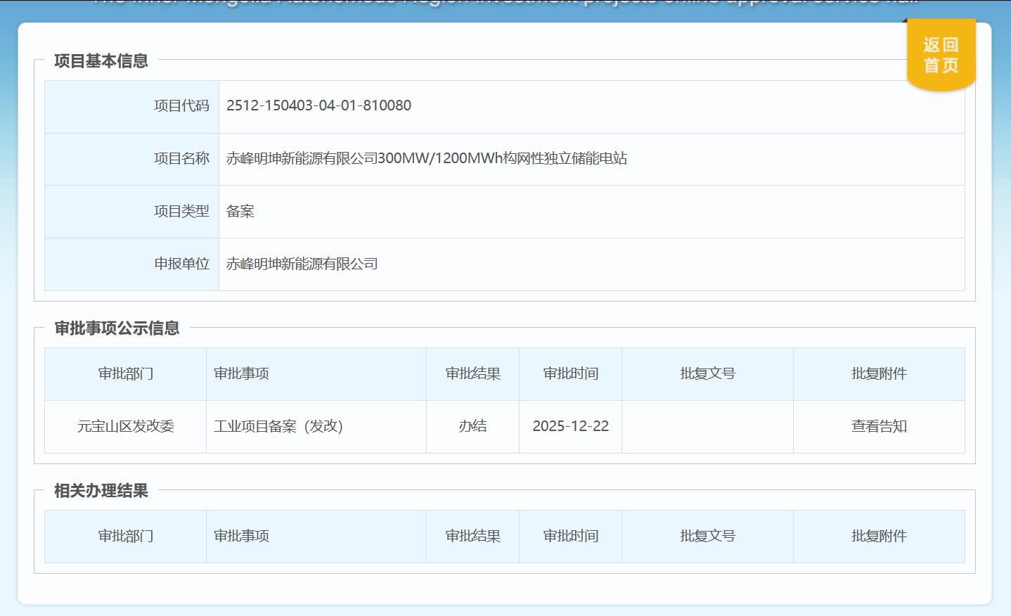 12月22日,内蒙古自治区投资项目在线审批办事大厅出具备案告知书,赤峰坤明新能源有限公司投资建设的 300MW/1200MWh构网型独立储能电站项目正式完成备案,标志着这一总投资 10.8 亿元的能源项目进入落地实施阶段。