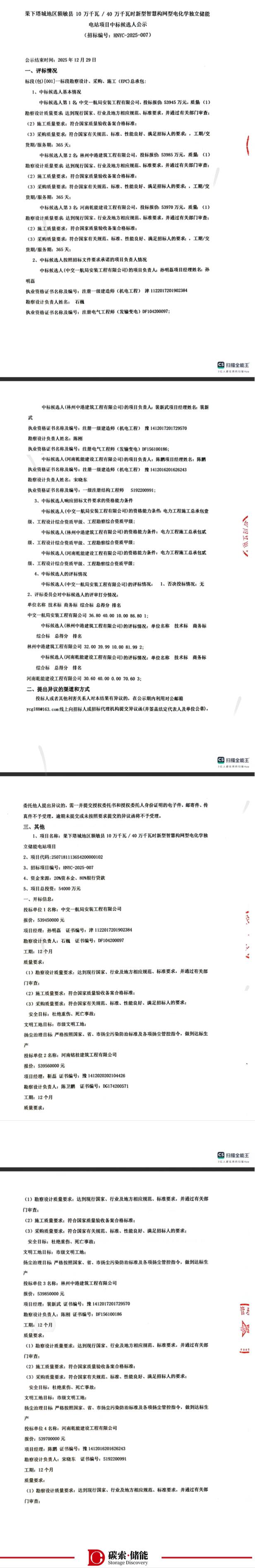 碳索储能网获悉,12月24日,果下塔城地区额敏县100MW/400MWh新型智慧构网型电化学独立储能电站项目发布中标候选人公示。据悉,该项目第一中标候选人为中交一航局安装工程有限公司,投标报价53945万元,折合单价1.3486元/Wh;第二中标候选人为林州中港建筑工程有限公司,投标报价53985万元。折合单价1.3496元/Wh;第三中标候选人为河南乾能建设工程有限公司,投标报价53970万元,折合单价1.3493元/Wh。计划工期12个月。