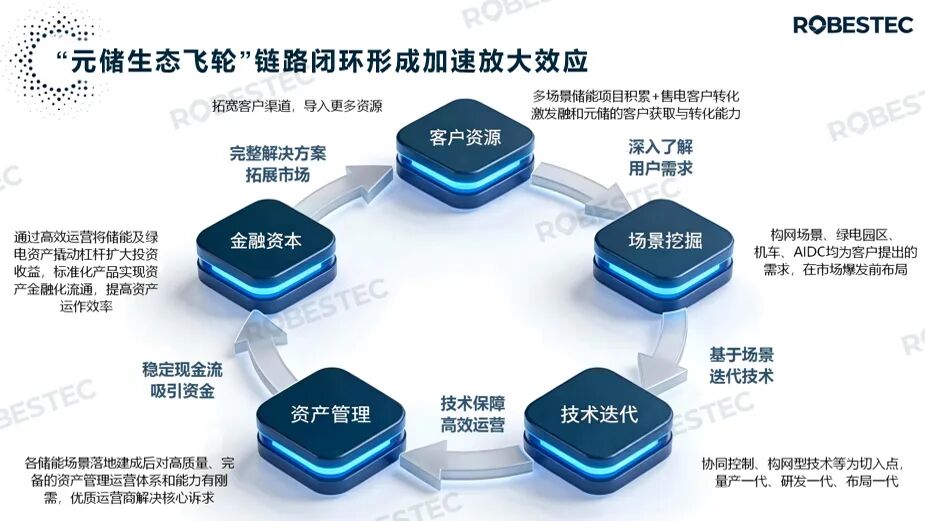 “元储·海内经”不仅是一个技术架构,更像是一个和使用者协同可持续演进的操作系统。它通过客户资源导入、场景深度挖掘、技术应用分享、功能集合迭代、资产聚合运营、资本流通赋能等环节联动,形成“生态飞轮”效应,在降低能源优化门槛的同时,携手合作伙伴共建生态,实现储能资产在全生命周期内的价值最大化,以及生态合作伙伴的收益最大化。