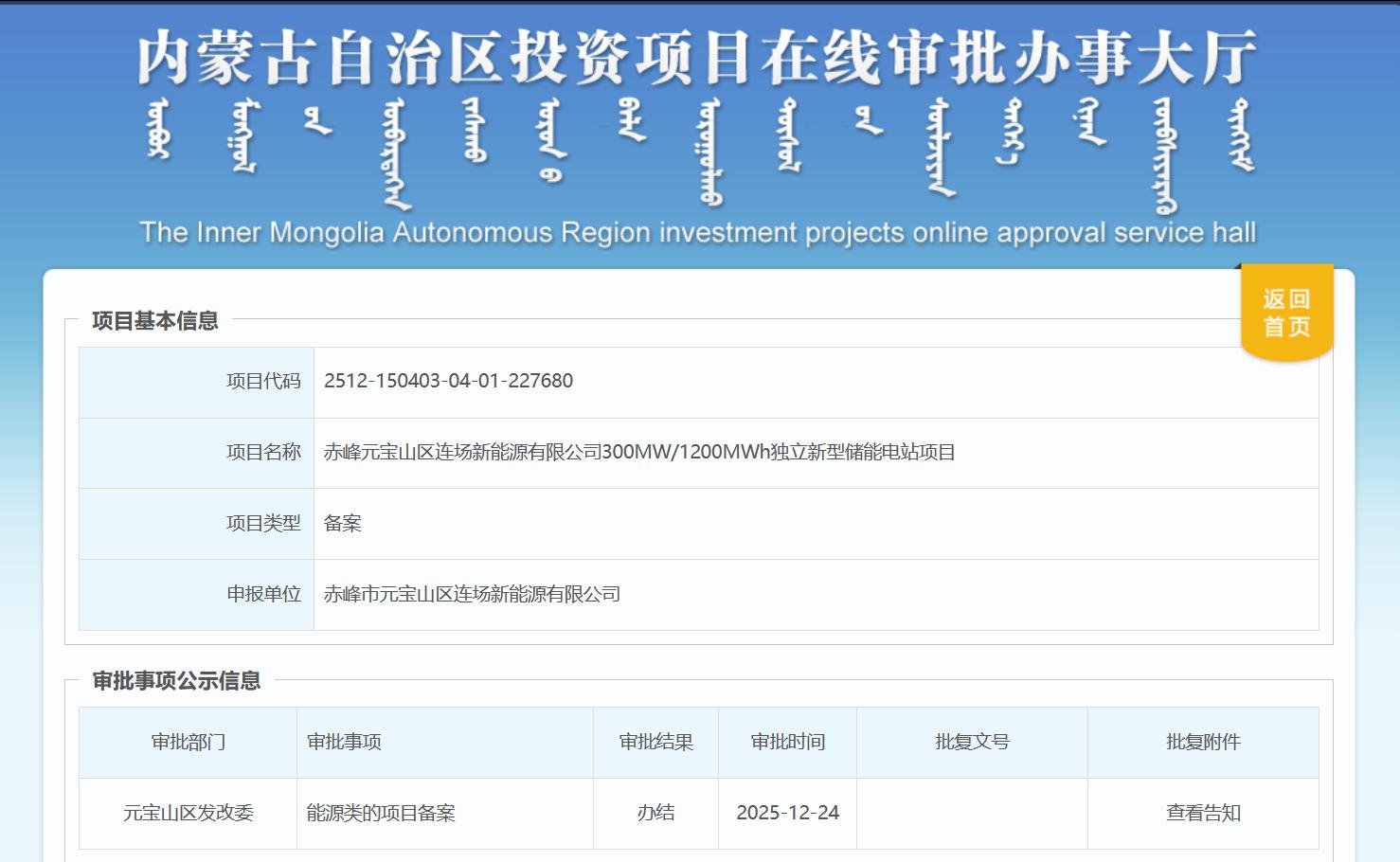 近日,赤峰市元宝山区连场新能源有限公司申报的 “300MW/1200MWh 独立新型储能电站项目” 正式取得项目备案告知书,标志着这一总投资达 10 亿元的能源基础设施项目进入实质推进阶段。
