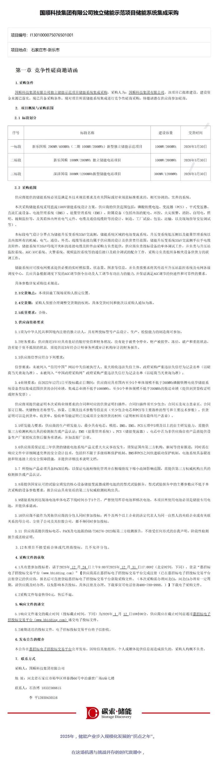 招标公告显示,共分为三个标段,总规模为500MW/1.6GWh。采购人为国顺科技集团有限公司。具体如下: