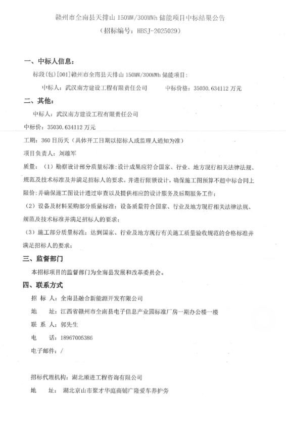 碳索储能网获悉,12月26日,赣州市全南县天排山150MW/300MWh储能项目发布中标结果公告。