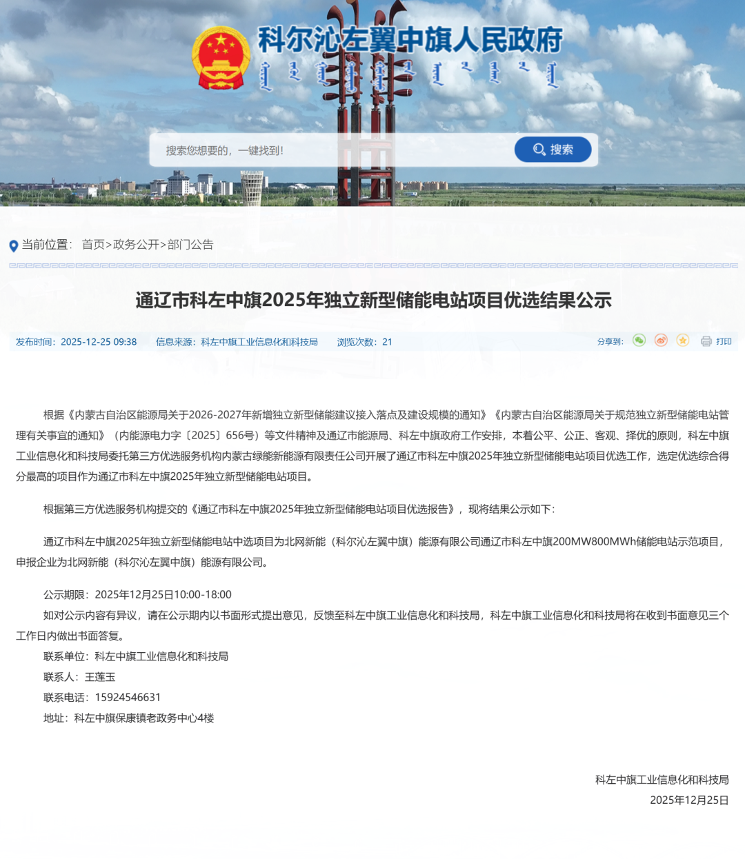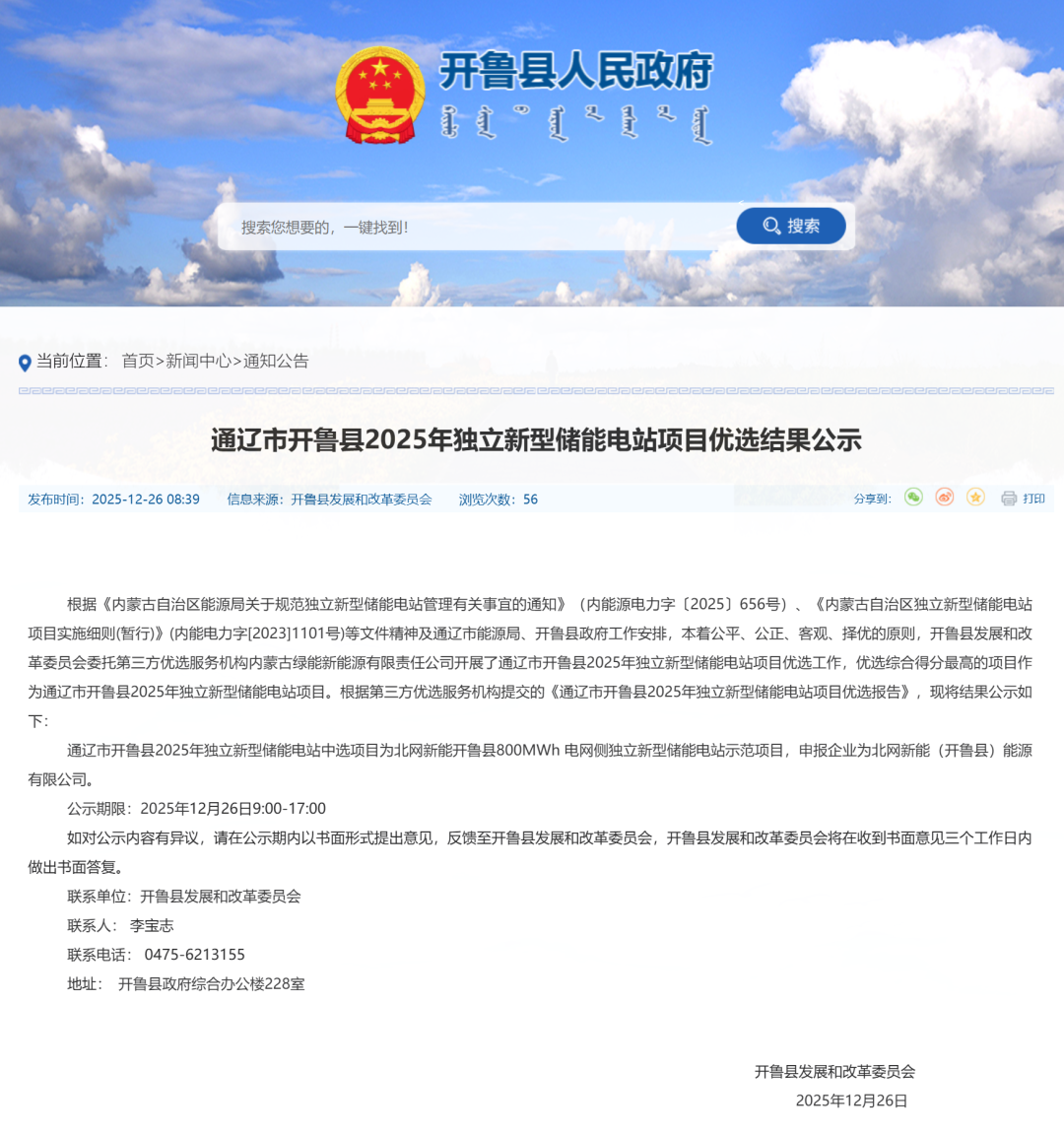 碳索储能网获悉,12月25、26日,通辽市科左中旗2025年独立新型储能电站项目、通辽市开鲁县2025年独立新型储能电站项目优选结果公示。