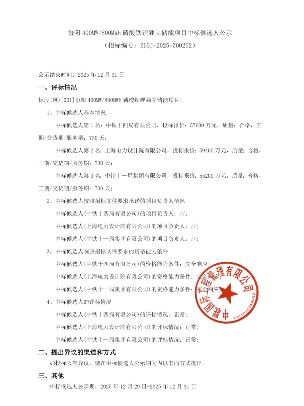 2025 年 12 月 29 日,汾阳 400MW/800MWh 磷酸铁锂独立储能项目发布中标候选人公示。