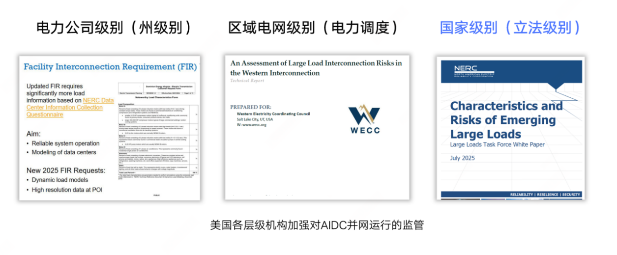 为应对上述挑战,电网公司对AIDC的并网审核提出了新的要求。同样以北美为例,继弗吉尼亚州数据中心脱网事故后,北美电力系统监管的核心机构——北美电力可靠性委员会(NERC)紧急建立工作组,推动制定一系列并网新规来应对此类风险挑战。其中特别指出,应推动AIDC类大负载的建模开发,在并网前的多个环节进行稳态和暂态仿真,并按需进行特殊仿真评估。这一严苛程度,可能超越部分区域对新能源场站的并网研究要求。