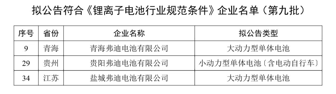 近日,中华人民共和国工业和信息化部正式发布第九批符合《锂离子电池行业规范条件》企业名单。