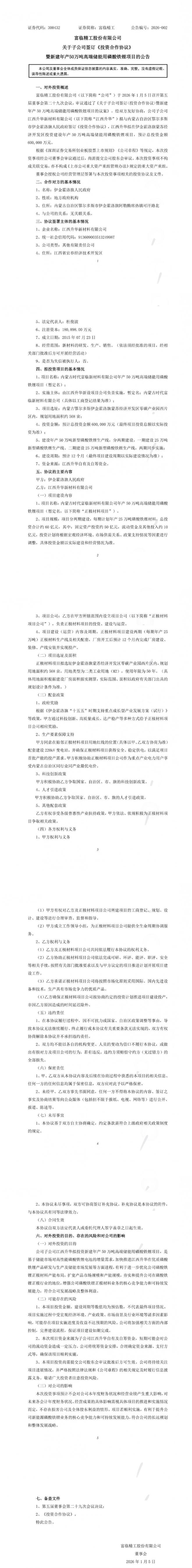 1月5日,富临精工发布公告称,公司子公司江西升华新材料有限公司拟与内蒙古自治区鄂尔多斯市伊金霍洛旗人民政府签订《投资合作协议》,江西升华拟在伊金霍洛旗蒙苏经济开发区投资建设年产50万吨高端储能用磷酸铁锂项目,预计总投资金额600,000万元。