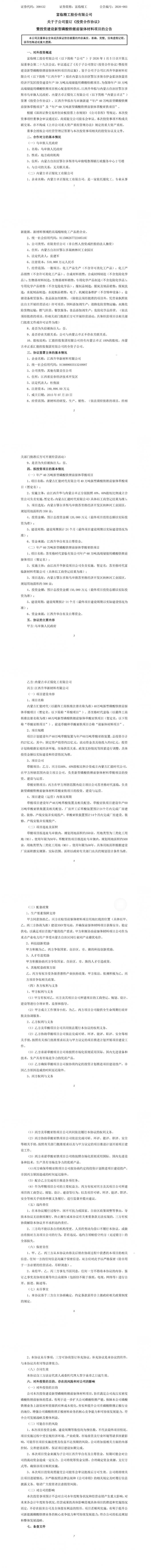 1月5日,富临精工发布公告称,鉴于公司子公司江西升华新材料有限公司(以下简称“江西升华”)拟在内蒙古自治区鄂尔多斯市伊金霍洛旗蒙苏经济开发区投资建设年产50万吨高端储能用磷酸铁锂项目,为保障年产50万吨高端储能用磷酸铁锂项目核心配套原料供应,江西升华拟与内蒙古自治区鄂尔多斯市乌审旗人民政府、内蒙古卓正煤化工有限公司(以下简称“内蒙古卓正”)签署《投资合作协议》,江西升华拟在乌审旗新建“年产40万吨新型磷酸铁锂前驱体草酸项目”及“年产60万吨新型磷酸铁锂前驱体草酸亚铁项目”。