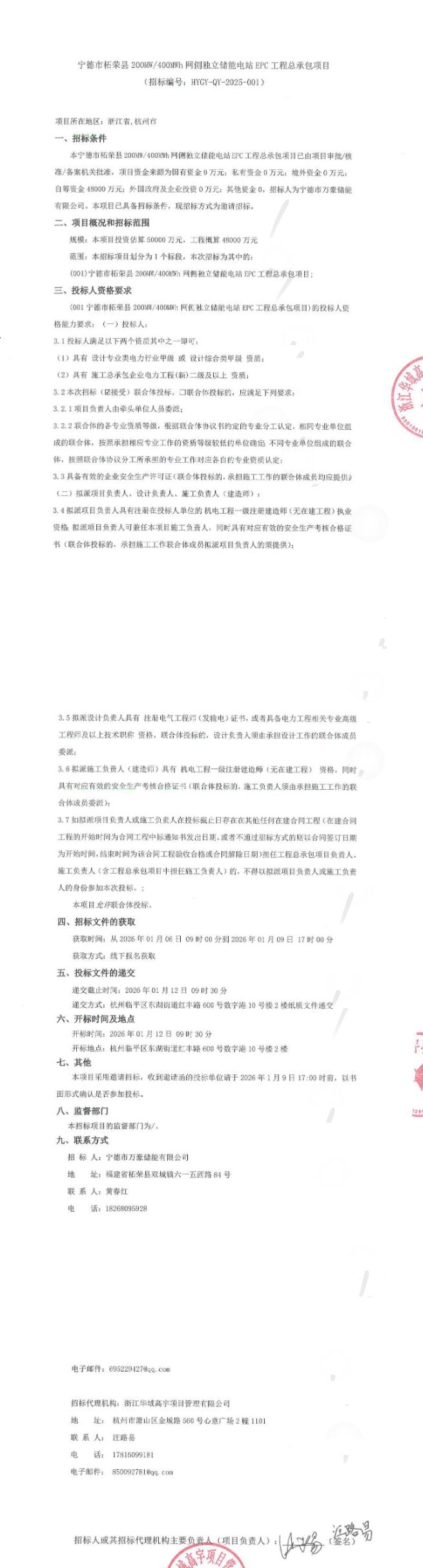1月6日,宁德市柘荣县200MW/400MWh网侧独立储能电站EPC工程总承包项目招标公告发布。