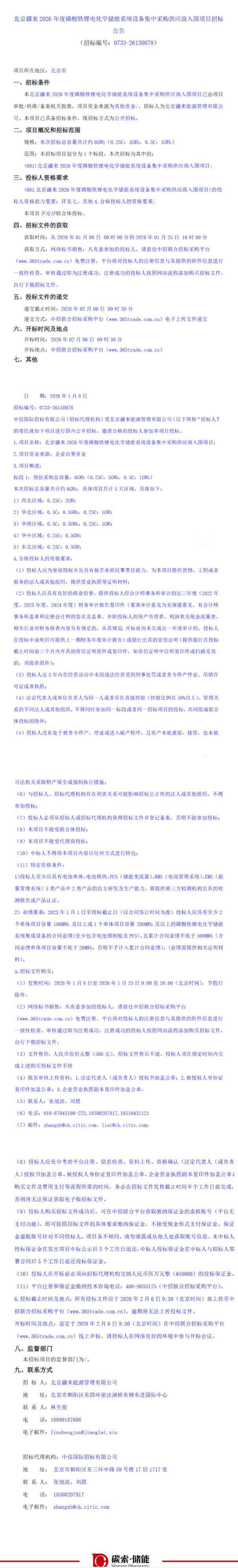 1月8日,北京疆来2026年度磷酸铁锂电化学储能系统设备集中采购供应商入围项目招标。