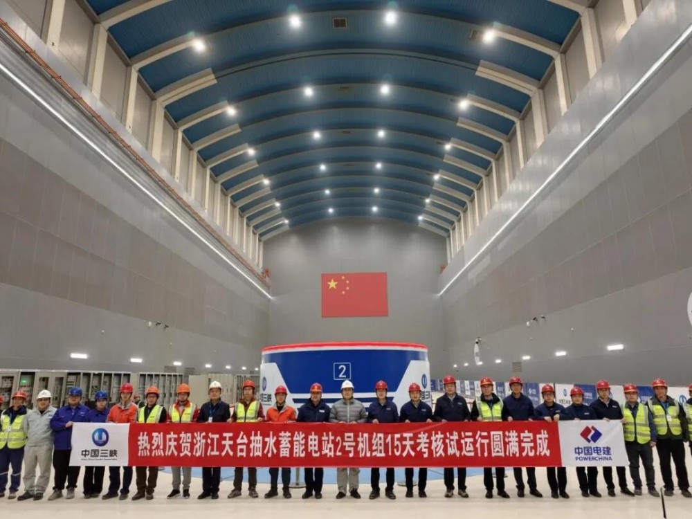 自2号机组段混凝土交面以来,三峡建工天台抽蓄公司统筹各参建单位凝心聚力、团结协作,先后于2025年4月24日完成转轮吊装、6月10日完成定子吊装、7月28日完成转子吊装,并于12月14日实现首次并网。此后仅用26天,便完成了2号机组全部并网调试及考核试运行工作。试运行期间,机组最高抽水扬程达766米,振动、摆度、温度等各项指标均符合设计要求。这标志着世界额定水头最高、单机容量最大的抽水蓄能机组在设计、制造、安装与调试等环节得到全面验证,也意味着我国在超高水头、超大容量抽水蓄能机组建设领域已达到世界领先水平。