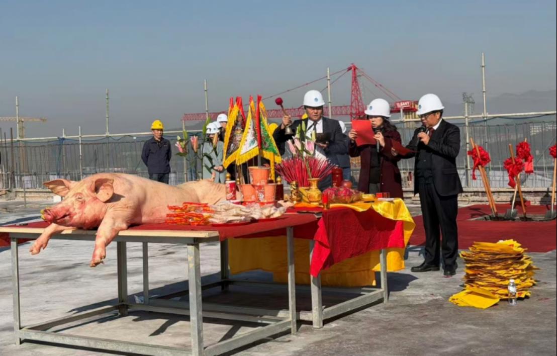 作为项目建设的重要节点,封顶仪式严格遵循传统礼仪规制,特别设置了拜天地祭祀环节,以传承文化根脉,祈求工程顺遂、事业昌隆。整套仪式流程规范、寓意深远,既表达了对天地自然的敬畏之心,也凝聚了全体建设者与参与者的共同期盼。