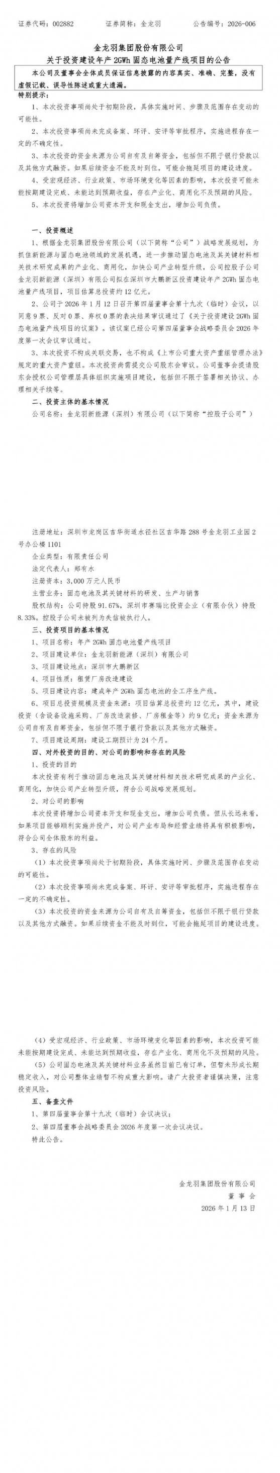 1月12日,金龙羽发布公告称,公司战略发展规划,为抓住新能源与固态电池领域的发展机遇,进一步推动固态电池及其关键材料相关技术研究成果的产业化、商用化,加快公司产业转型升级,公司控股子公司金龙羽新能源(深圳)有限公司拟在深圳市大鹏新区投资建设年产2GWh固态电池量产线项目,项目估算总投资约12亿元。