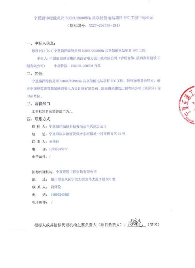 1月12日,宁夏鹏洋绿能灵州500MW/2000MWh共享储能电站项目EPC工程中标公示。