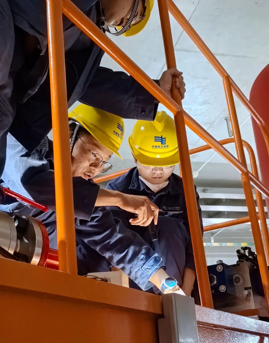 如果说南宁蓄能公司是电站安全的“守护者”,那么南网储能公司西部修试公司就是机组调试的“技术医生”。西部修试公司专业技术团队充分发挥技术优势,深度参与机电设备安装与调试,用精湛的技艺为机组保驾护航,让每一个部件都精准就位。机组考核试运行期间,团队更是开启“全天候驻守”模式,24小时跟踪机组运行状态,成为机组的“贴身医生”。