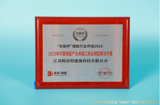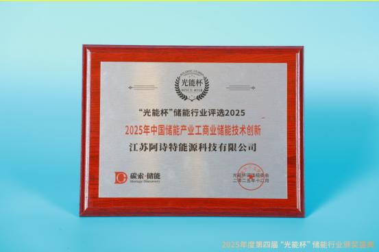 本届“光能杯”共有100余家储能企业参与报名评选,角逐年度荣誉。此次颁奖盛典中,江苏阿诗特凭借强大创新力、出色的品质与服务、卓越的品牌影响力,荣膺2025年中国储能产业卓越工商业储能解决方案、2025年中国储能产业工商业储能技术创新等奖项。作为光,储,氢领域持续时间最长的评选活动之一,“光能杯”储能行业评选凭借专业的评审体系,权威的行业认可度,已成为衡量企业实力的"金标准"与洞察产业趋势的重要窗口。