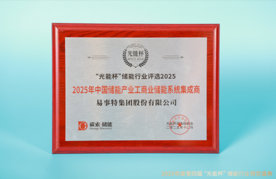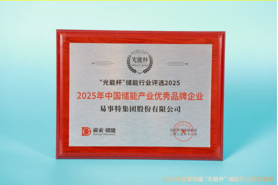 本届“光能杯”共有100余家储能企业参与报名评选,角逐年度荣誉。此次颁奖盛典中,易事特储能凭借强大创新力、出色的品质与服务、卓越的品牌影响力,荣膺2025年中国储能产业工商业储能系统集成商、2025年中国储能产业优秀品牌企业。