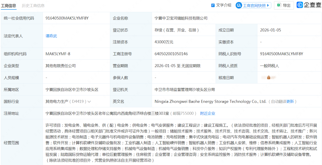 近日,宁夏中卫宝河储能科技有限公司成立,法定代表人为谭政武,注册资本为4.3亿元。