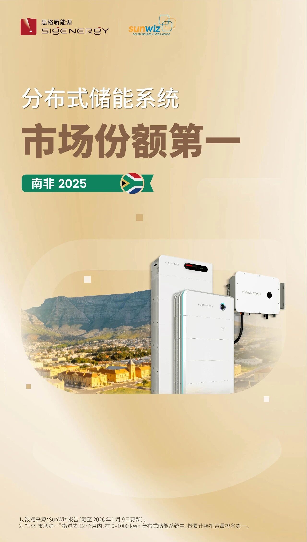 根据权威咨询机构 SunWiz 发布的市场报告,基于过去 12 个月的累计装机容量统计,思格新能源在 2025 年南非分布式储能系统市场中排名第一。