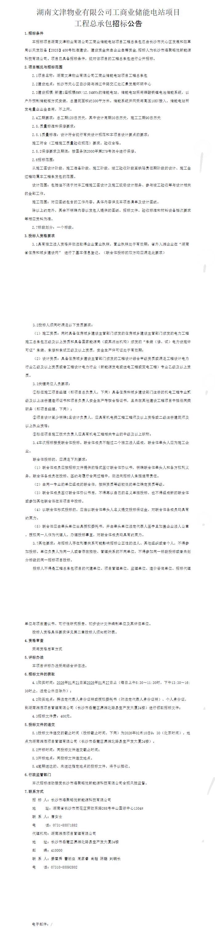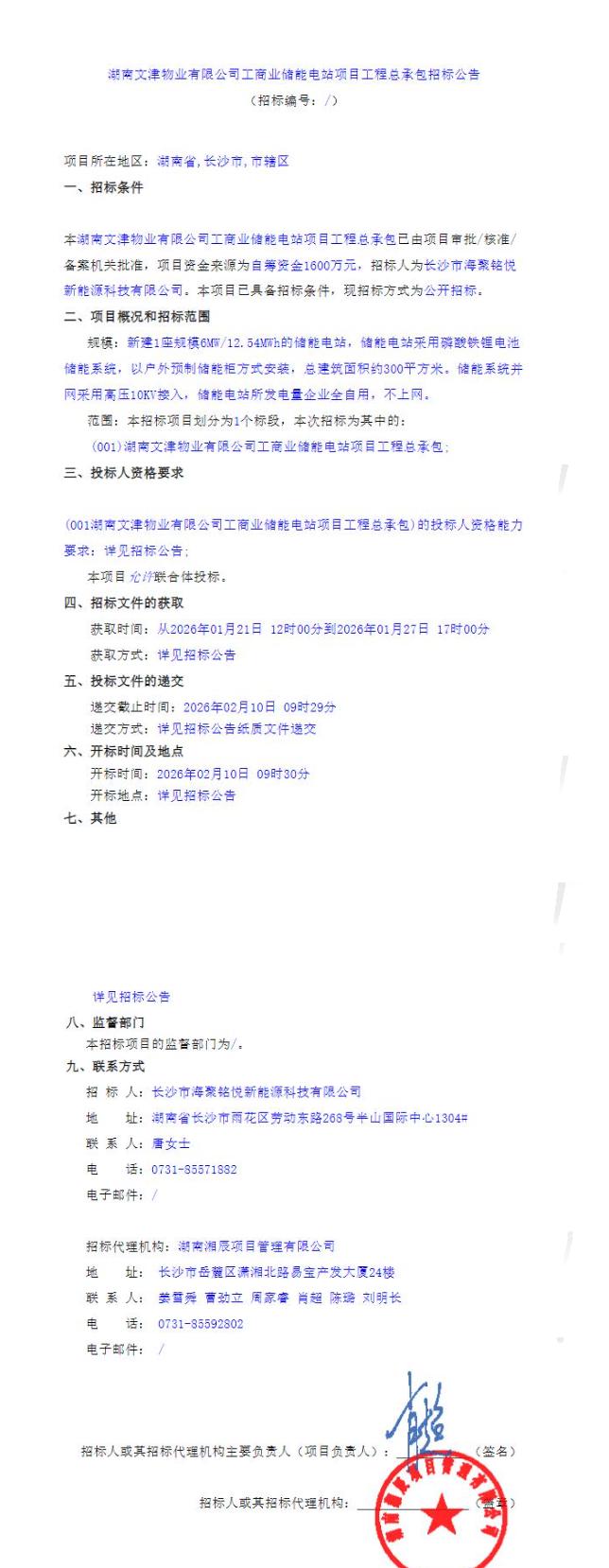 1月21日,湖南文津物业有限公司工商业储能电站项目工程总承包招标公告发布。