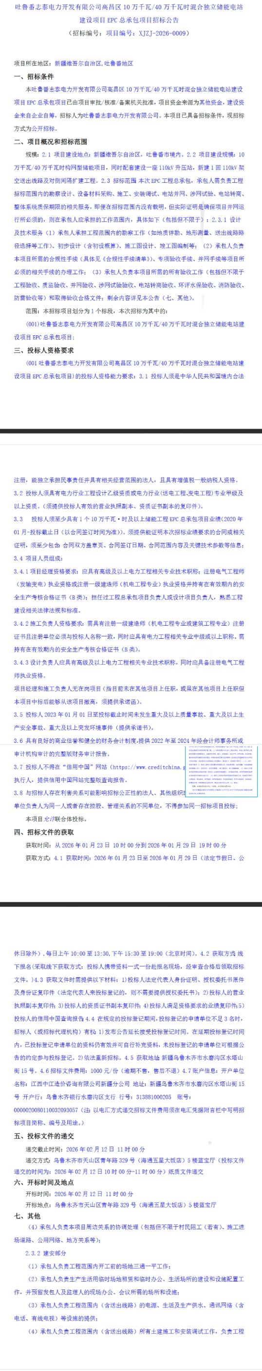 碳索储能网获悉,1月23日,吐鲁番志泰电力开发有限公司高昌区10万千瓦/40万千瓦时混合独立储能电站建设项目EPC总承包项目招标公告。