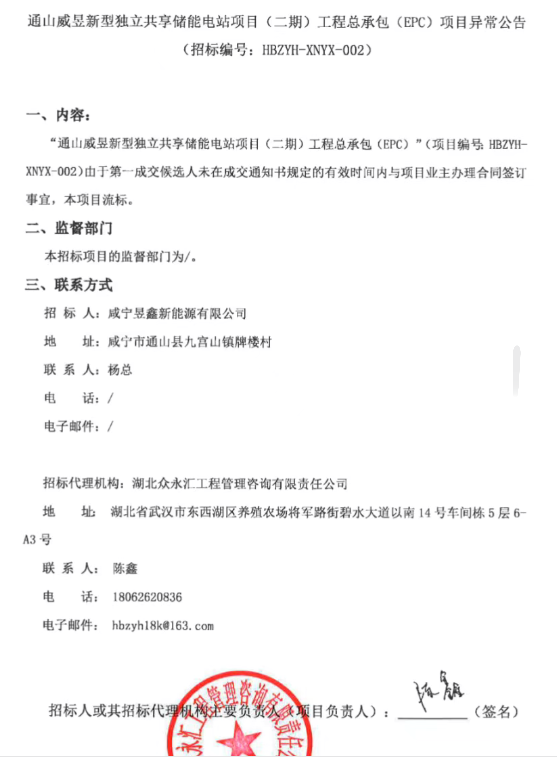 1月27日,“通山威昱新型独立共享储能电站项目(二期)工程总承包(EPC)”(项目编号:HBZYH-XNYX-002)由于第一成交候选人未在成交通知书规定的有效时间内与项目业主办理合同签订事宜,项目流标。