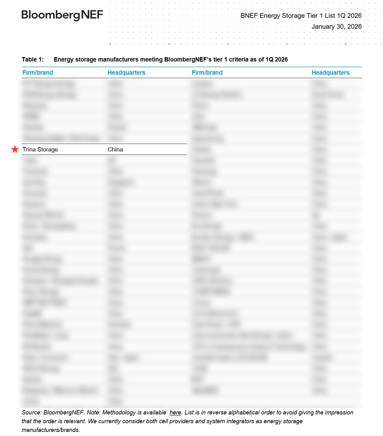 近日,全球清洁能源行业权威研究机构彭博新能源财经(BNEF)公布了2026年第一季度的全球储能系统供应商评级榜单。天合储能凭借其在技术研发、系统集成、全球项目交付及市场表现等方面的综合卓越实力,再次入选Tier 1名单。这标志着天合储能已连续九个季度稳居这一全球储能行业最具公信力的榜单第一梯队,持续刷新行业领先纪录,再次巩固了其作为全球储能系统解决方案领导者的行业地位。