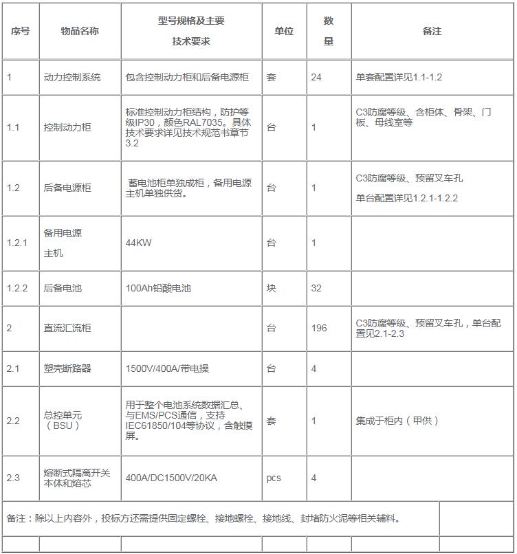2.2招标范围:1GWh储能项目直流汇流系统采购,供货范围:铅碳电池直流汇流系统分部件及专用工具的产品设计、生产、检验和试验、包装、保险、运输到目的地、交货、培训、安装指导、功能实现,同时配合甲方工厂生产和试验、参加试运行,负责质量保修工作。详见下表。