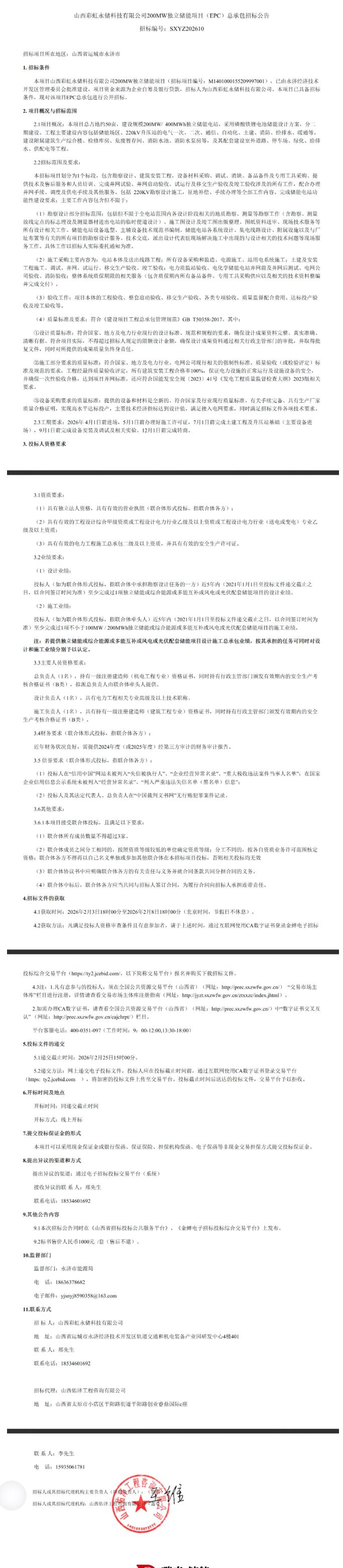 碳索储能网获悉,2月3日,山西彩虹永储科技有限公司200MW独立储能项目(EPC)总承包招标公告。