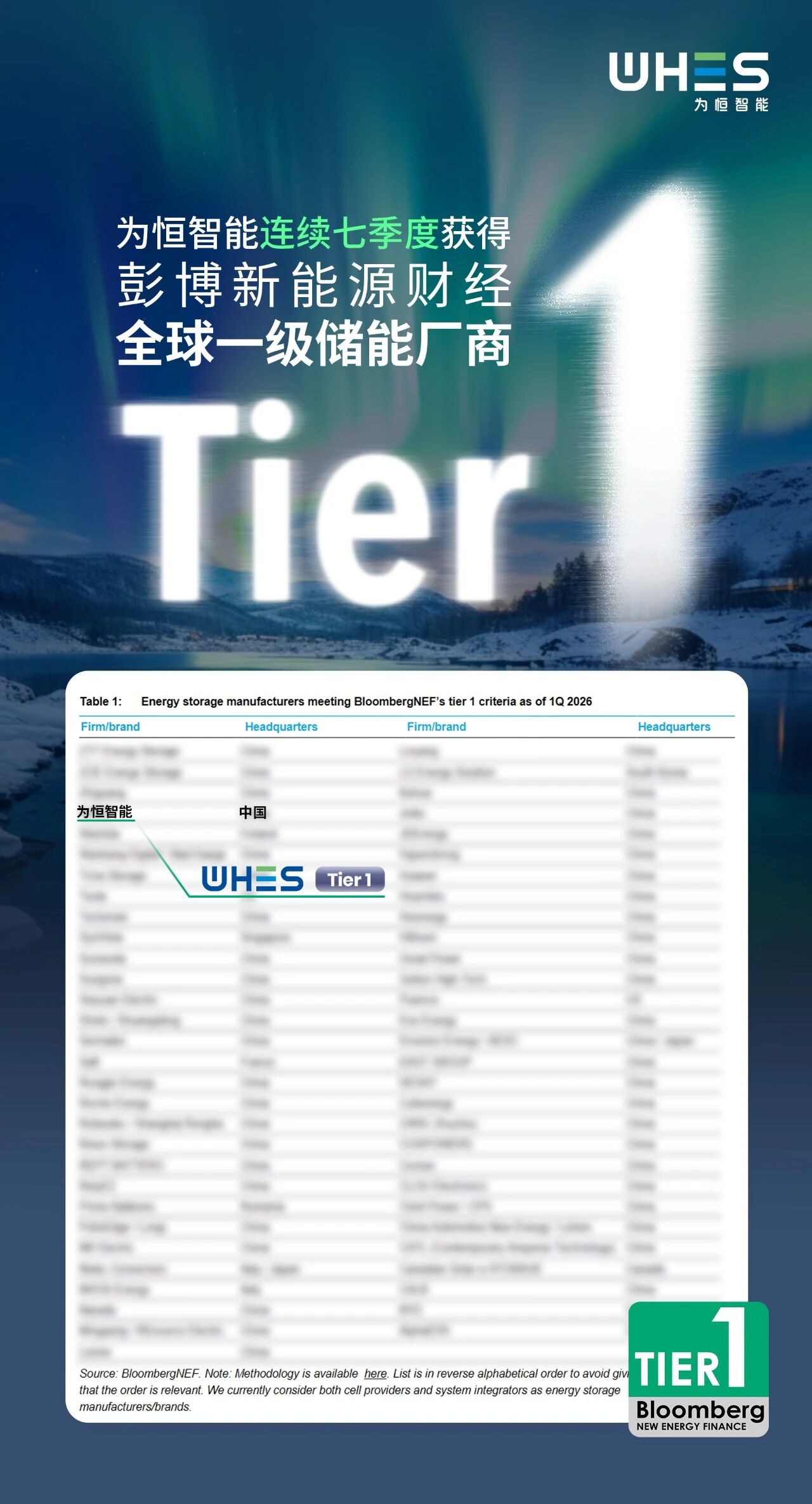 近日,彭博新能源财经(BNEF)正式发布2026年第一季度全球一级储能厂商(Tier 1)榜单。为恒智能凭借领先的技术硬实力与卓越的商业可持续性,连续第七个季度稳居Tier 1行列,再度彰显其在全球储能市场的核心竞争力与长期价值。