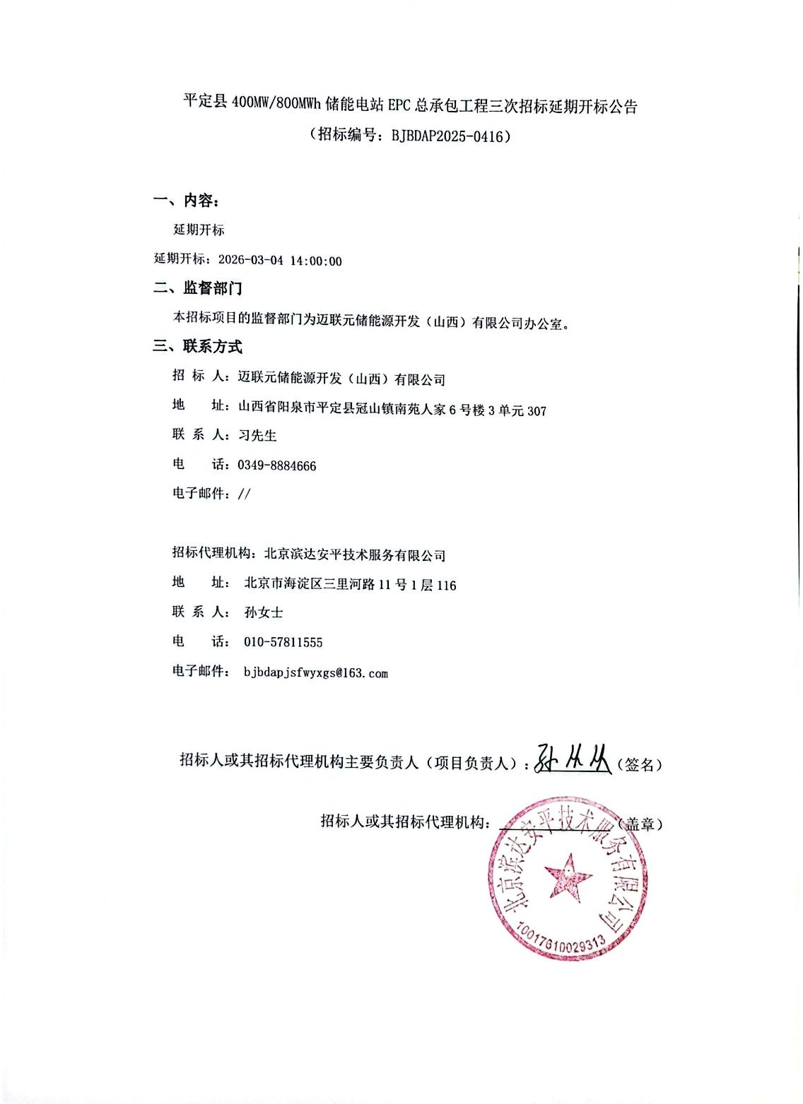 碳索储能网获悉,2月4日,平定县400MW/800MWh储能电站EPC项目发布第三次招标延期开标公告。