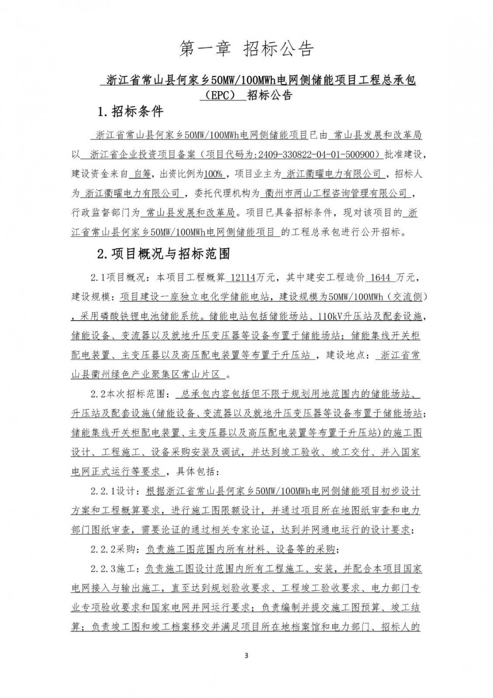 2月3日,浙江省常山县何家乡50MW/100MWh电网侧储能项目工程总承包(EPC)招标公告发布。