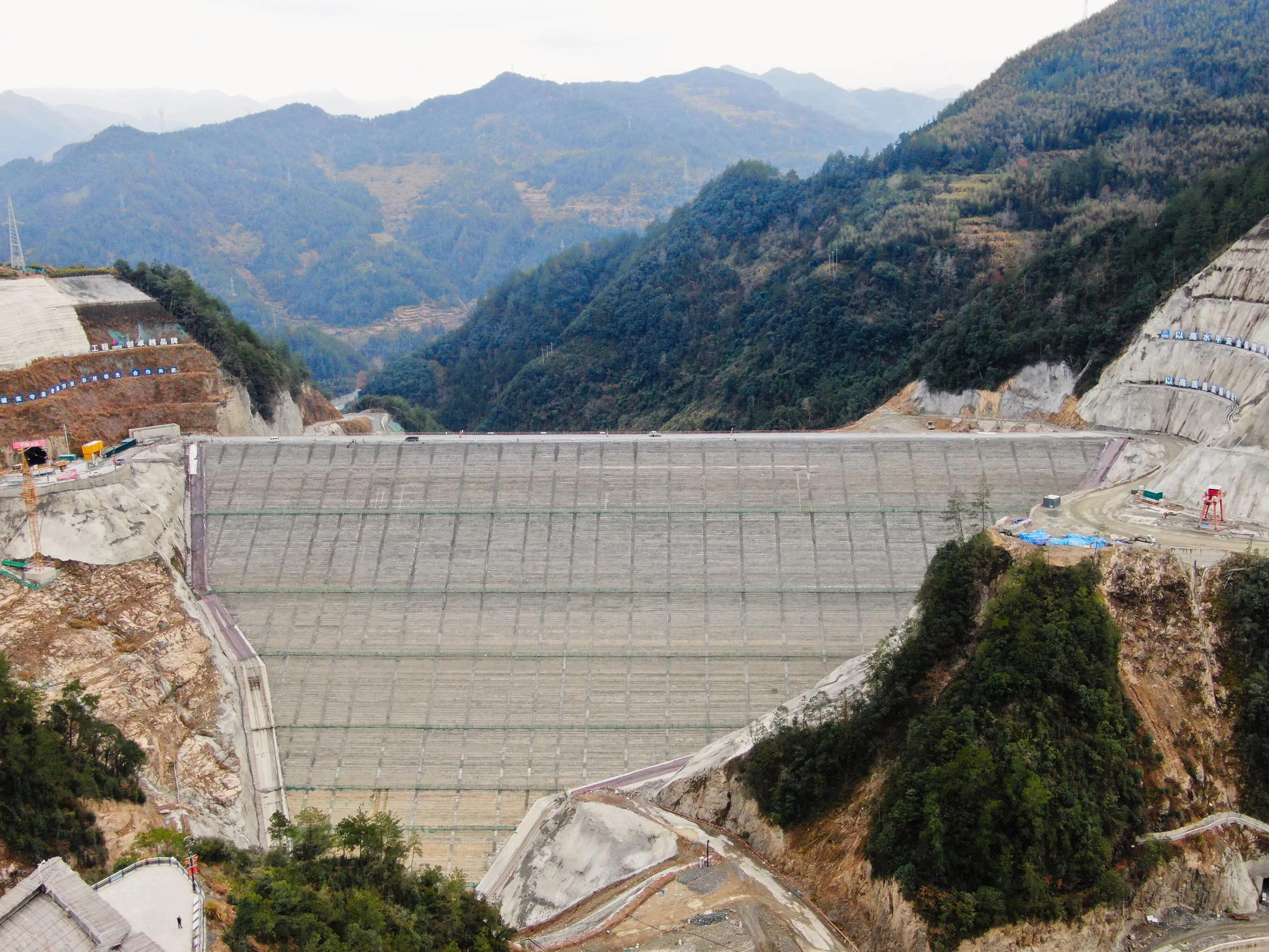 电站位于浙江省丽水市景宁畲族自治县,是国家“十四五”能源发展规划重点工程、浙江省“十四五”可再生能源发展重点项目。总装机容量1400兆瓦,安装4台350兆瓦可逆式水轮发电机组,设计年发电量14亿千瓦时,建成后将承担浙江电网调峰、填谷、调频、调相及紧急事故备用等重要任务。本次完成填筑的下水库大坝为钢筋混凝土面板堆石坝,坝顶高程391.00米,最大坝高122米,坝顶长326.60米,坝顶宽度10.0米,填筑方量295.7万方。