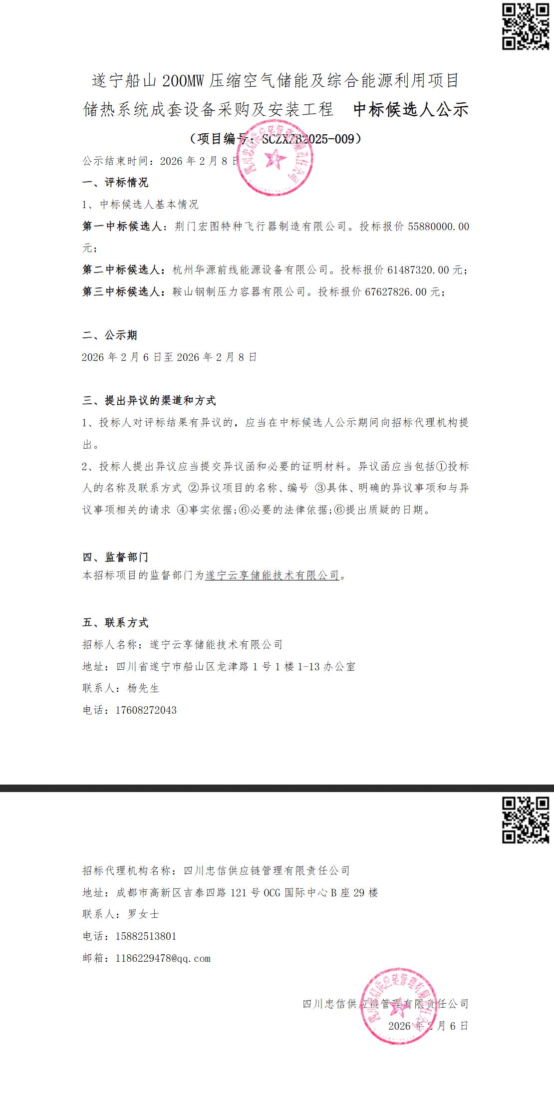 碳索储能网获悉,2月6日,遂宁船山200MW压缩空气储能及综合能源利用项目储热系统成套设备采购及安装工程发布中标候选人公示。