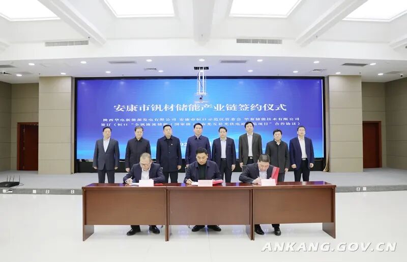 2022年2月18日,陕西省安康市召开钒材储能产业链链长制工作会议。会上,华电陕西能源有限公司与华秦储能技术有限公司签订《光伏+液流储能(国家级)项目战略合作协议》,华电陕西能源有限公司与恒口示范区管委会、华秦储能技术有限公司签订《恒口“全钒液流储能(国家级)+农光互补光伏电站示范项目”合作协议》。