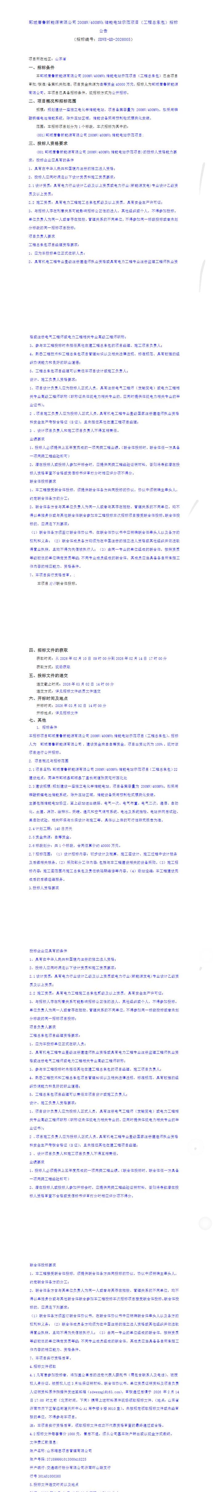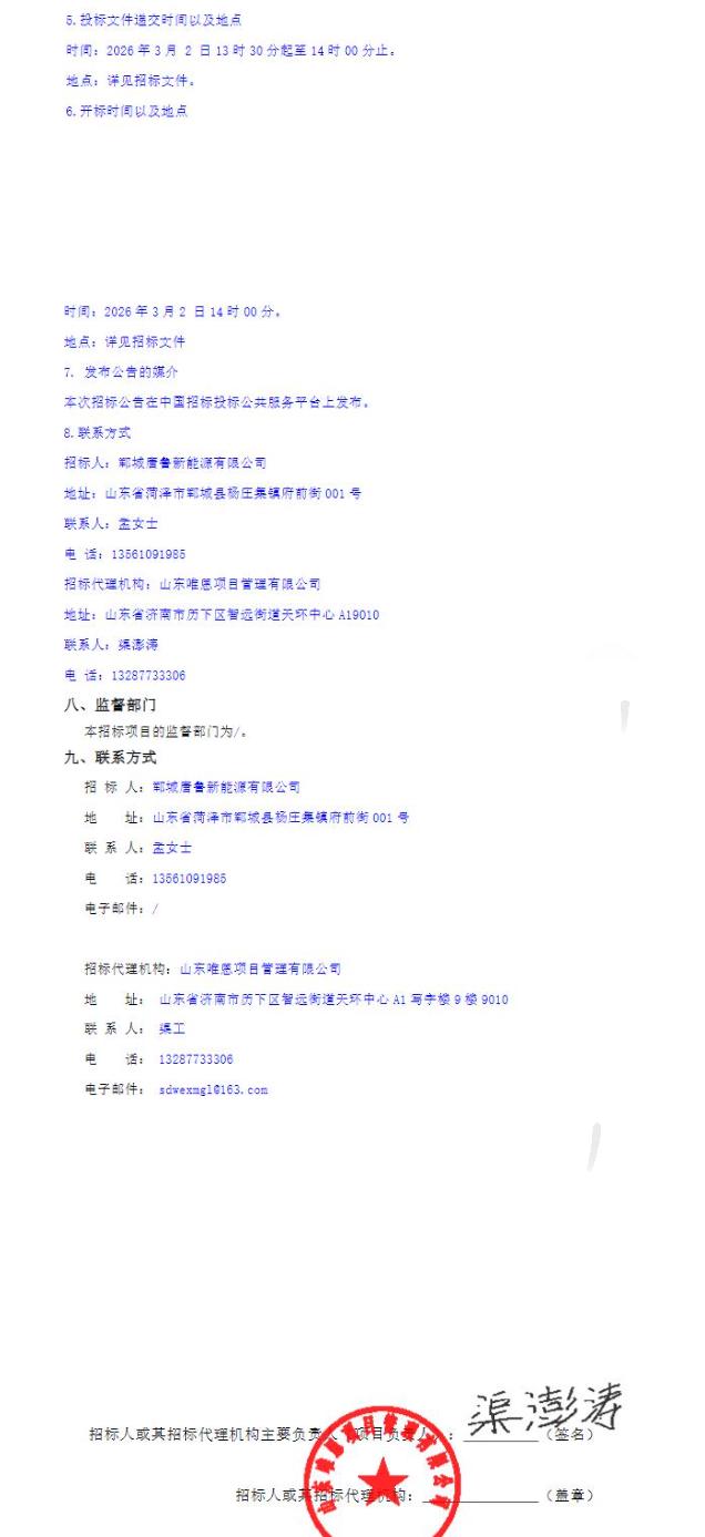 2月9日,郓城唐鲁新能源有限公司200MW/400MWh储能电站示范项目(工程总承包)招标公告发布。
