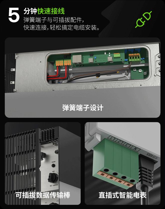 传统储能设备的电缆接线常需工具拧紧螺丝、逐线校对,易出错且耗时。HiOne采用弹簧端子设计,用户只需将线缆插入即可,牢固且安全。同时,系统主要连接部件均采用可插拔配件,大幅缩短接线时间。用户可以彻底告别繁琐工具操作,让安装过程回归简单与高效。