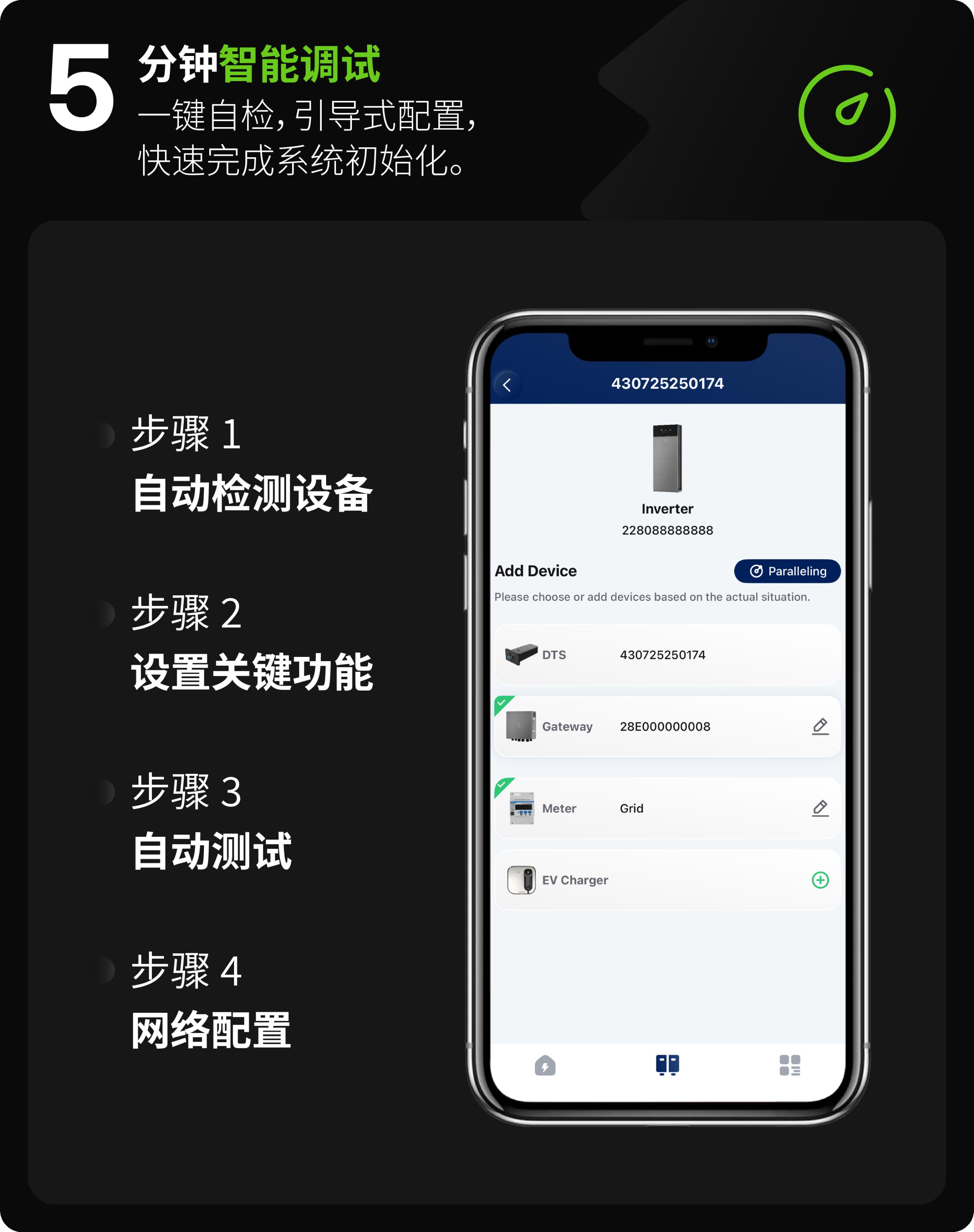 硬件安装完成后,HiOne的智能调试系统可引导用户快速完成初始化。系统会自动识别所有已连接模块,进行电路自检、电池状态诊断与通信测试,并引导用户设置基础参数。整个过程通过手机App或本地界面清晰提示,无需专业知识,5分钟内系统即可投入运行。相比之下,传统储能设备往往需要专业人员现场配置数小时,HiOne真正做到了“开机即用”。