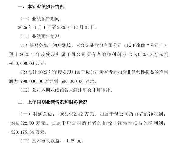 经财务部门初步测算,天合光能预计2025年年度实现归属于母公司所有者的净利润为-75亿元到-65亿元;预计归属于母公司所有者的扣除非经常性损益的净利润为-79亿元到-69亿元。