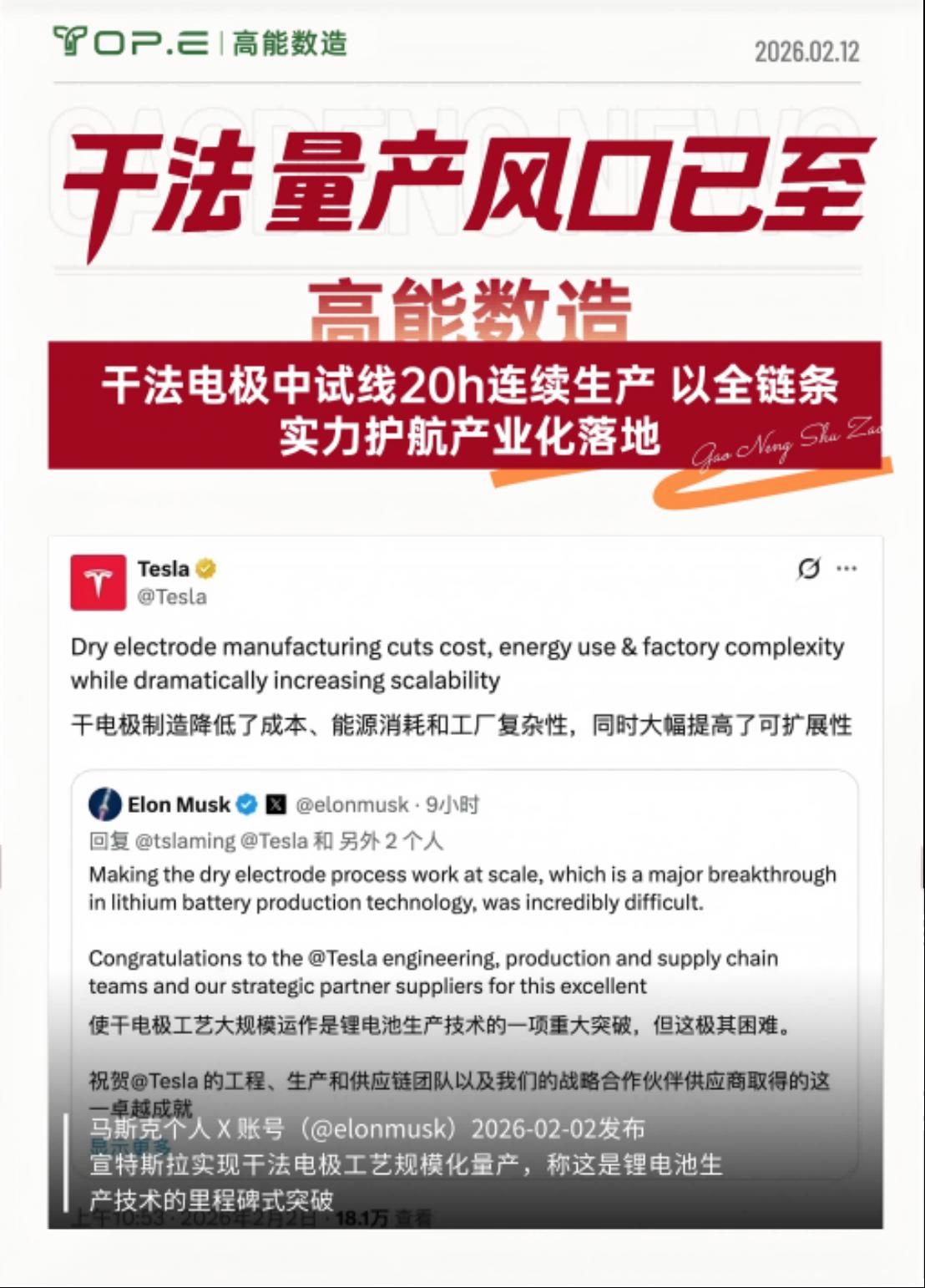 锂电产业干法量产时代正式来临!特斯拉干法电极工艺规模化量产落地,印证了干法工艺从实验室走向产业化的行业必然趋势,新能源电池产业向无溶剂、高效率、低成本的转型已进入关键窗口期。